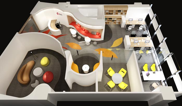 本案設計面積為180平方正方形辦公空間,通過俯視圖可以看出整個空間被設計師分為前臺、接待區(qū)、洽談區(qū)、交流區(qū)、辦公區(qū)、老總辦公室、小型會議室,通過欣賞可以看出此處的色彩更加明顯,這是一個色彩點綴下的辦公空間,顯示出設計師對空間、色彩的掌控力。
