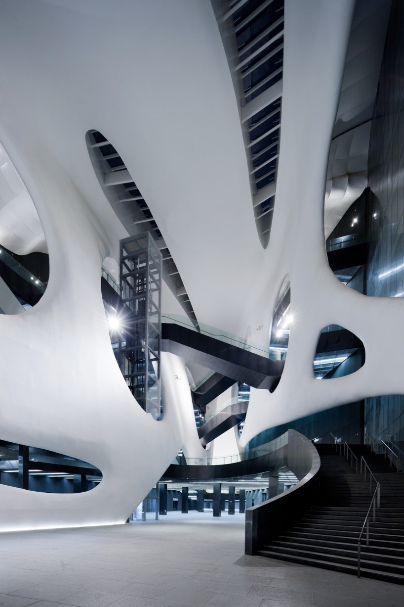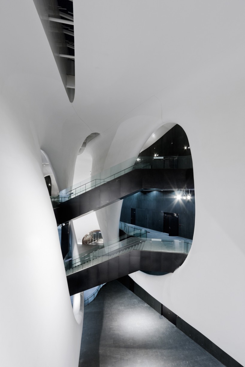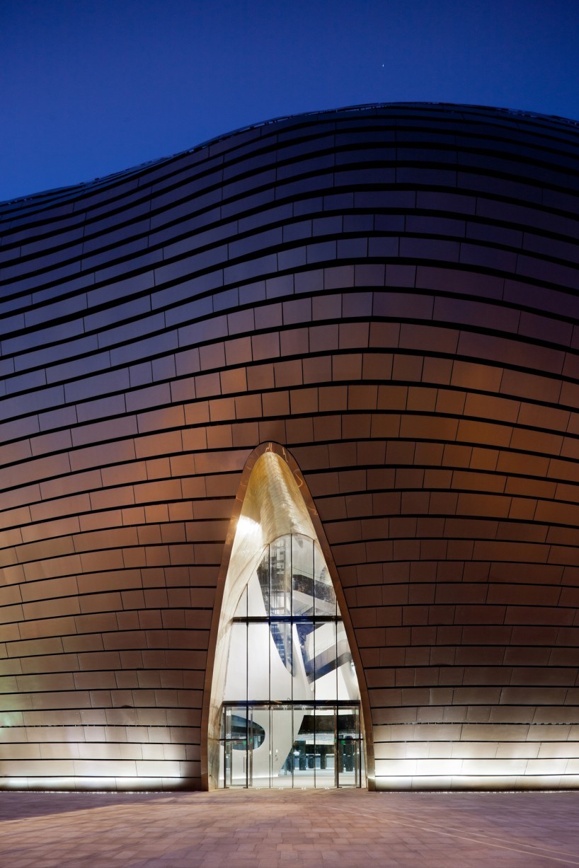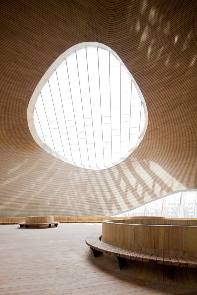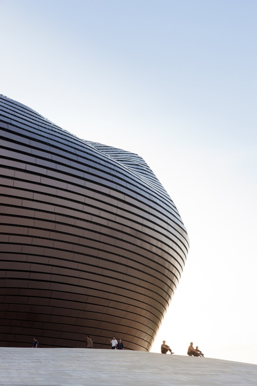 受到巴克明斯特·富勒(R. Buckminster Fuller)的“曼哈頓穹頂”的啟發(fā),MAD設(shè)想了一個(gè)帶有未來(lái)主義色彩的抽象的殼體,在它將內(nèi)外隔絕的同時(shí)也對(duì)其內(nèi)部的文化和歷史片段提供了某種保護(hù),來(lái)反駁現(xiàn)實(shí)中周遭未知的新城市規(guī)劃。博物館漂浮在如沙丘般起伏的廣場(chǎng)上 ,這似乎是在向不久前剛剛被城市景觀替代而成為歷史的自然地貌致敬。市民們?cè)谄鸱牡孛嫔嫌螒蛲鏄?lè),歇息眺望;甚至早在博物館還未完工時(shí),這里就已經(jīng)成為大眾,兒童和家庭最喜愛(ài)的聚集場(chǎng)所。