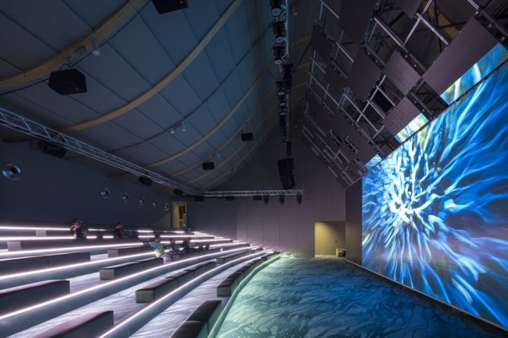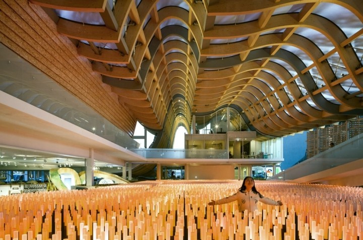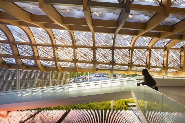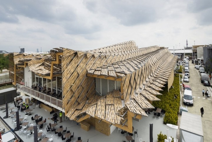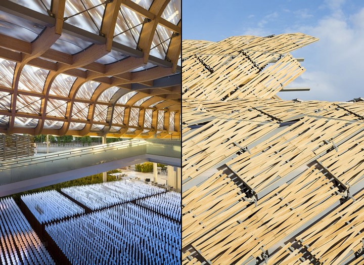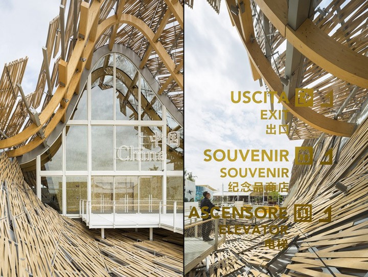 屋頂采用具有中國象征意義的竹編材料覆蓋,在意大利燦爛陽光的照射下,將折射出金色的光彩。對應米蘭的日照軌跡,屋頂竹編面材通過傳統(tǒng)編制工藝選擇不同的透光率,將自然采光引入室內,滿足了功能照明要求,降低了人工照明的能耗,也大幅度降低了材料成本。