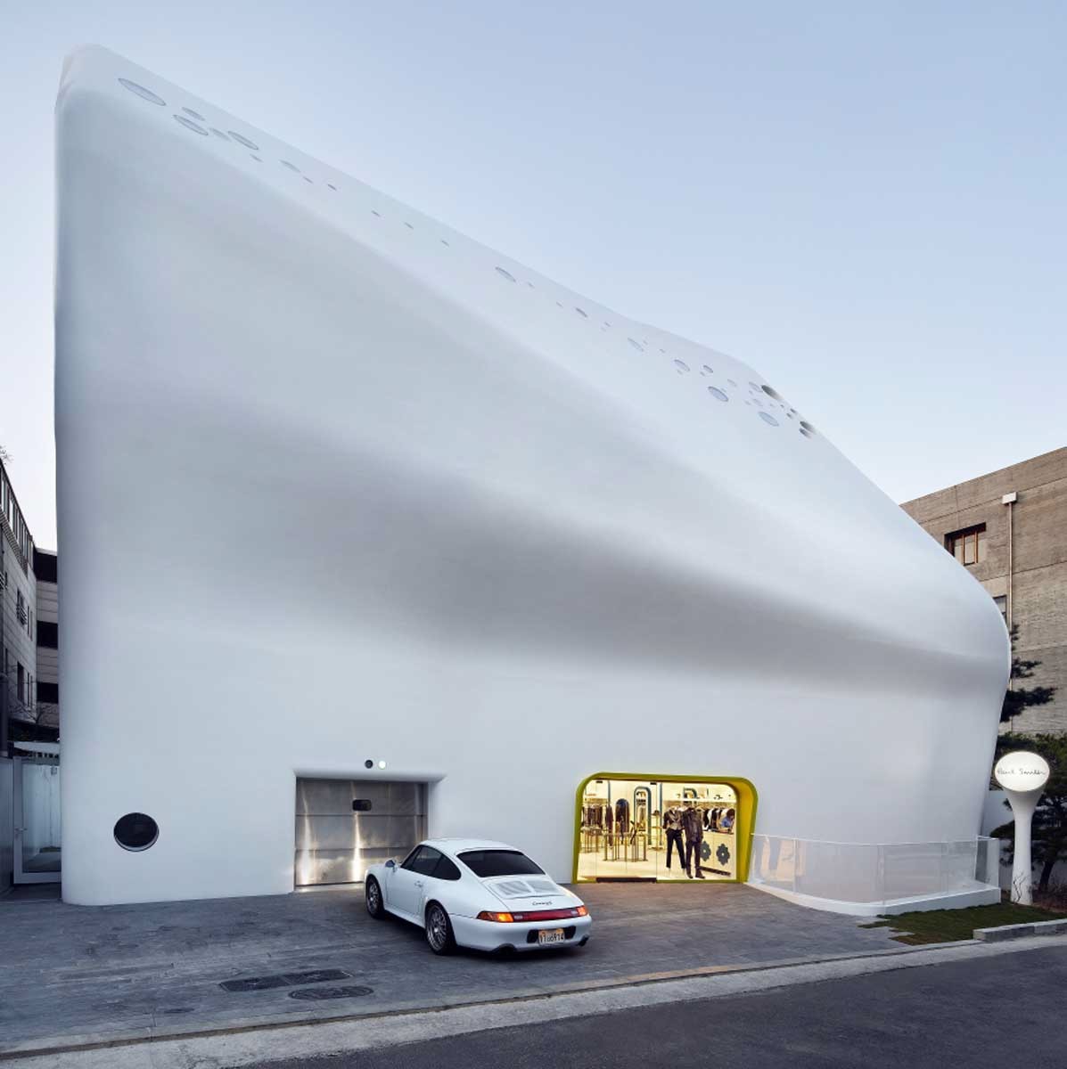 這是由THE_SYSTEM LAB設(shè)計(jì)的Paul Smith旗艦店,這是英國(guó)最著名的時(shí)裝品牌Paul Smith在亞洲開(kāi)設(shè)的首家旗艦店,位于首爾江南區(qū)。考慮到這里街道兩邊開(kāi)滿了品牌專賣(mài)店,競(jìng)爭(zhēng)激烈。建筑師考慮到Paul Smith時(shí)裝品牌的主要特色,結(jié)合了客戶的情況進(jìn)行設(shè)計(jì)。Paul Smith旗艦店被設(shè)計(jì)成一種交通工具,融入到城市環(huán)境中。建筑獨(dú)特的造型是預(yù)定的,但對(duì)建筑的解讀是開(kāi)放的,取決于每個(gè)客戶獨(dú)特的理解,從而創(chuàng)建不同的故事。