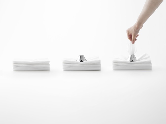 這是和三宅一生的合作項(xiàng)目:作為三宅一生代表作的褶皺服飾Pleate Please Issey Miyake 并不是直接用帶有褶皺的布料制作而成的,而是設(shè)計(jì)師事先計(jì)算好某件衣服會有多少褶皺,然后將裁好的布料做出基本造型,在用一種專門制造褶皺的機(jī)器加熱,將褶皺固定下來,這種褶皺加工器會用到大量的褶皺紙,并且這宗用完的褶皺紙都是被直接扔掉的。當(dāng)時(shí)三宅一生對佐藤提出了一個(gè)問題,“能不能用這種一次性的褶皺紙做些什么呢”?