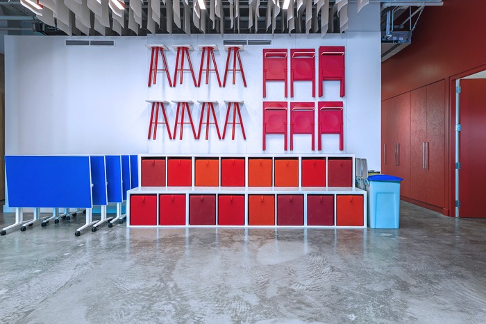 交流區(qū)域的設(shè)計:當(dāng)桌椅收攏起來之后,此處空間就擁有了更多的可能,這也是設(shè)計師設(shè)計的初衷,椅子被懸掛在墻體之上,儲藏柜按照層級依次向上,一方面可以在此處休息,另外一方面也為掛取椅子提供了保障,可折疊的桌子以此排列在儲藏柜的左側(cè),當(dāng)桌椅被收攏之后,被設(shè)計師巧妙的設(shè)計為空間的點綴物。