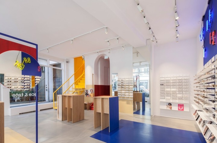 本案位于CBD地區(qū)的新眼鏡店,設(shè)計師采用幾何形狀和原色來喚起進入藝術(shù)家工作室的體驗,用明亮的色彩創(chuàng)造出一種“充滿活力和好玩的美學”。新空間坐落在丹麥首都的老舊城,它由一層鮮明的、極簡主義的混凝土地板和白色的墻壁組成,這些墻壁由紅色、藍色和黃色組成。 這家店被分成兩部分,分別是一段彎曲的拱門和一段通往一樓的黃色螺旋樓梯。從地板到天花板的窗戶纏繞在商店的周圍,使得自然光可以淹沒在前面的房間里。