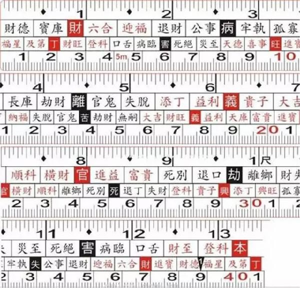 做生意一般取財字,不能用【義】字,太講義氣,生意無利可圖。只適用于道上兄弟或宗教廟宇。一般陽宅取用如能陰陽兩利(即門公尺、丁蘭尺皆吉)當然最好,但大體取【財】與【本】之間的紅字為準。【財】指財庫,本指本源,也意味源源不斷,通常取用尺法有如下規(guī)矩: