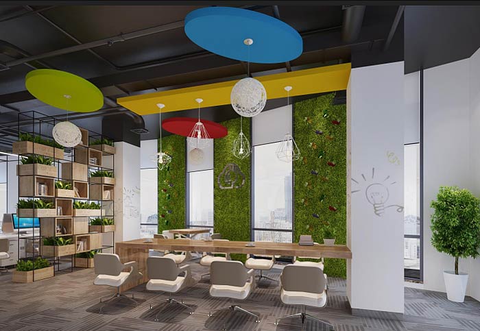 海淀區(qū)東升科技園科技辦公室休閑區(qū)設(shè)計(jì):休閑區(qū)采用簡(jiǎn)單的造型、與色彩相互搭配,使的整個(gè)空間高效、嚴(yán)謹(jǐn),休閑空間有休閑、辦公兩種屬性,綠植墻的出現(xiàn),是為了減輕長(zhǎng)時(shí)間看電腦的視覺(jué)疲勞。